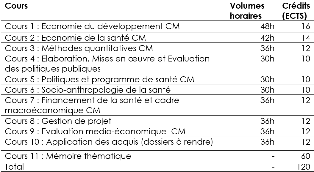 Ce tableau ci-dessous présente de manière détaillée sur le contenu de chacun des cours du Master.